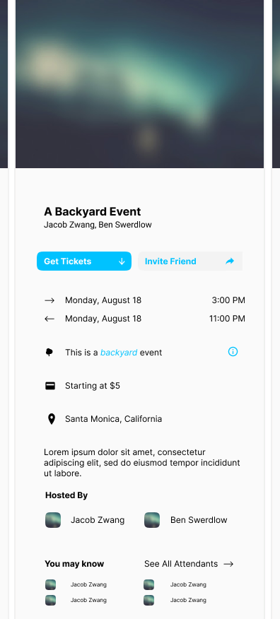 I created a unique UI system for Backyard which uses a horizontal stack allowing users to swipe between events, profiles, checkout screens, and any other components needed. When hyperlinks are clicked, it inserts a new segment adjacent to the user's current focus. This system allows for a seamless experience where at any time a user can view any information from any segment without canceling, closing, or diverting their attention.